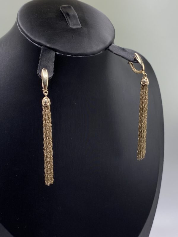 Золотые серьги 585 пробы. Длина- 6,5см, ширина- 5мм. Английский замок, отличное состояние. Вес- 5,36гр. Цена- 3.300 за грамм.